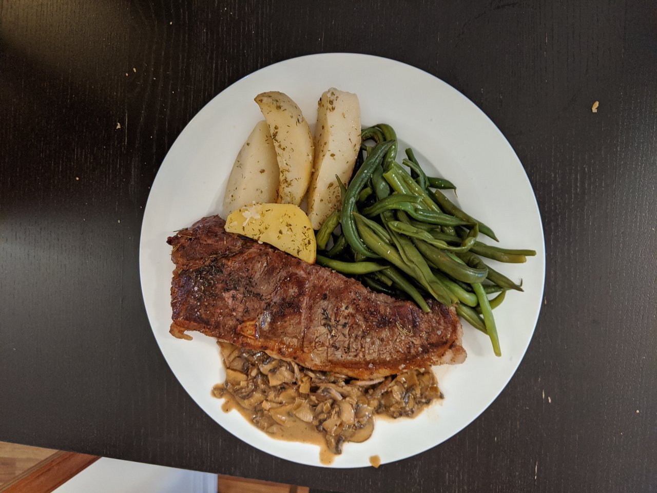 We felt fancy (and I bought steaks from Costco) so we had ourselves a nice steak dinner. First time making steaks in a while and I really enjoyed the process. Proper Mise en Place before I started, got the cast iron pan to the right temperature , timed everything well and as the steaks rested I made a mushroom pan sauce that was pretty good. Served the steaks with steamed green beans and leftover lemon potatoes.