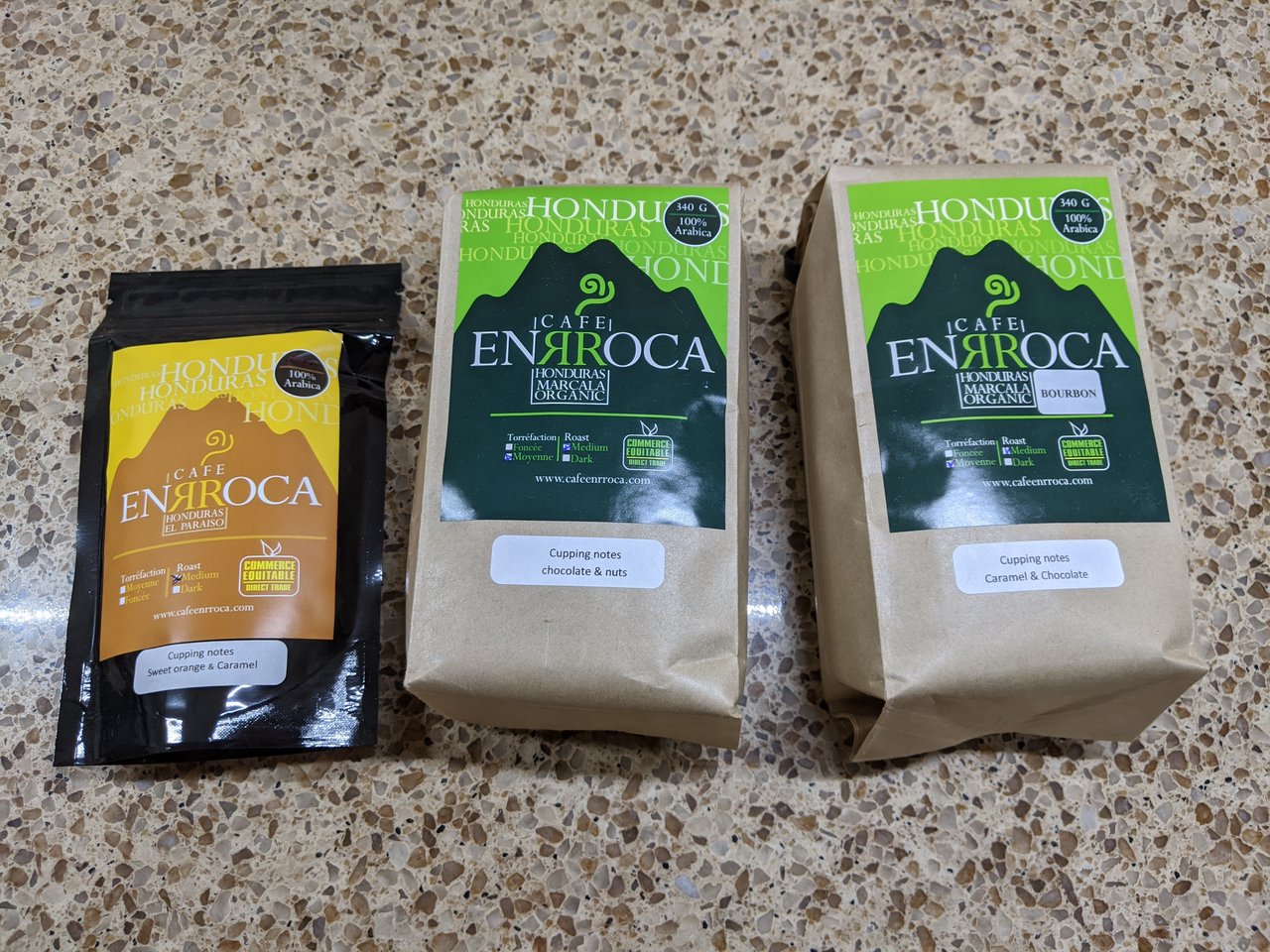 Ordered new coffee beans from Cafe Enrroca. I ordered the Marcala Organic and the Marcala Organic Bourbon and they sent me a free sample which is nice.