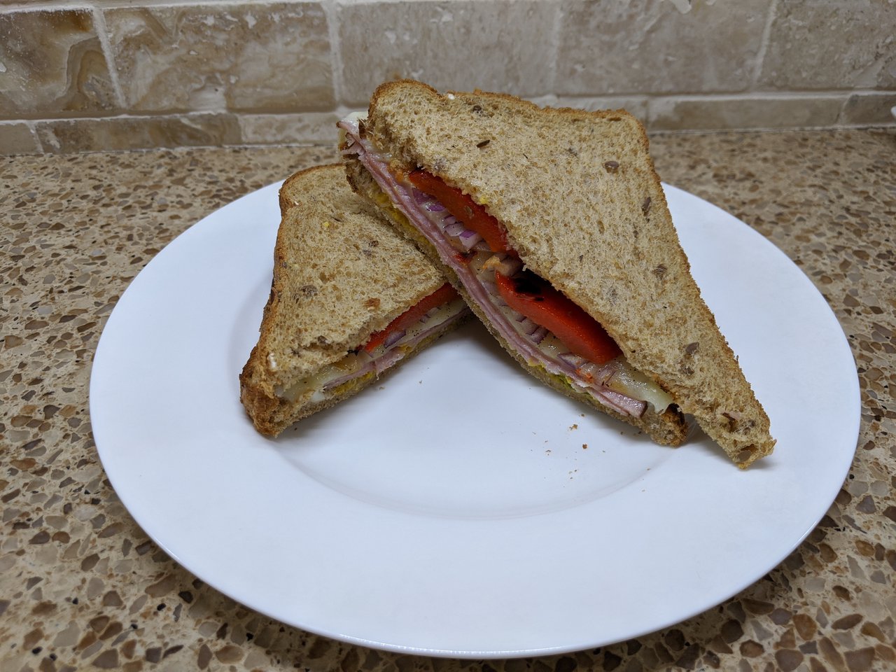 Was too lazy to make proper lunch so I threw together a sandwich. Charred red bell pepper and built a sandwich with pickles, ham, Havarti, red onion and the bell pepper.