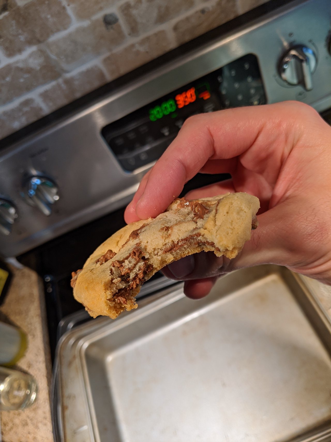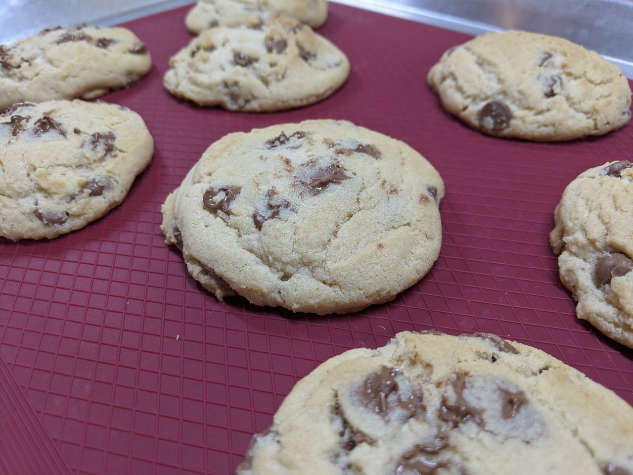 I had been craving chocolate chip cookies all day and decided to make some after dinner. However, no eggs left in the fridge so I used this recipe instead. The cookies came out nicely. I baked them longer than the recipe prescribed – 16 minutes vs 12 minutes – just to get some color on them. The texture was nice, slightly crispy on the outside, but still chewy on the inside.