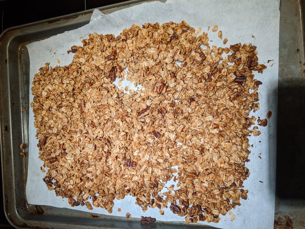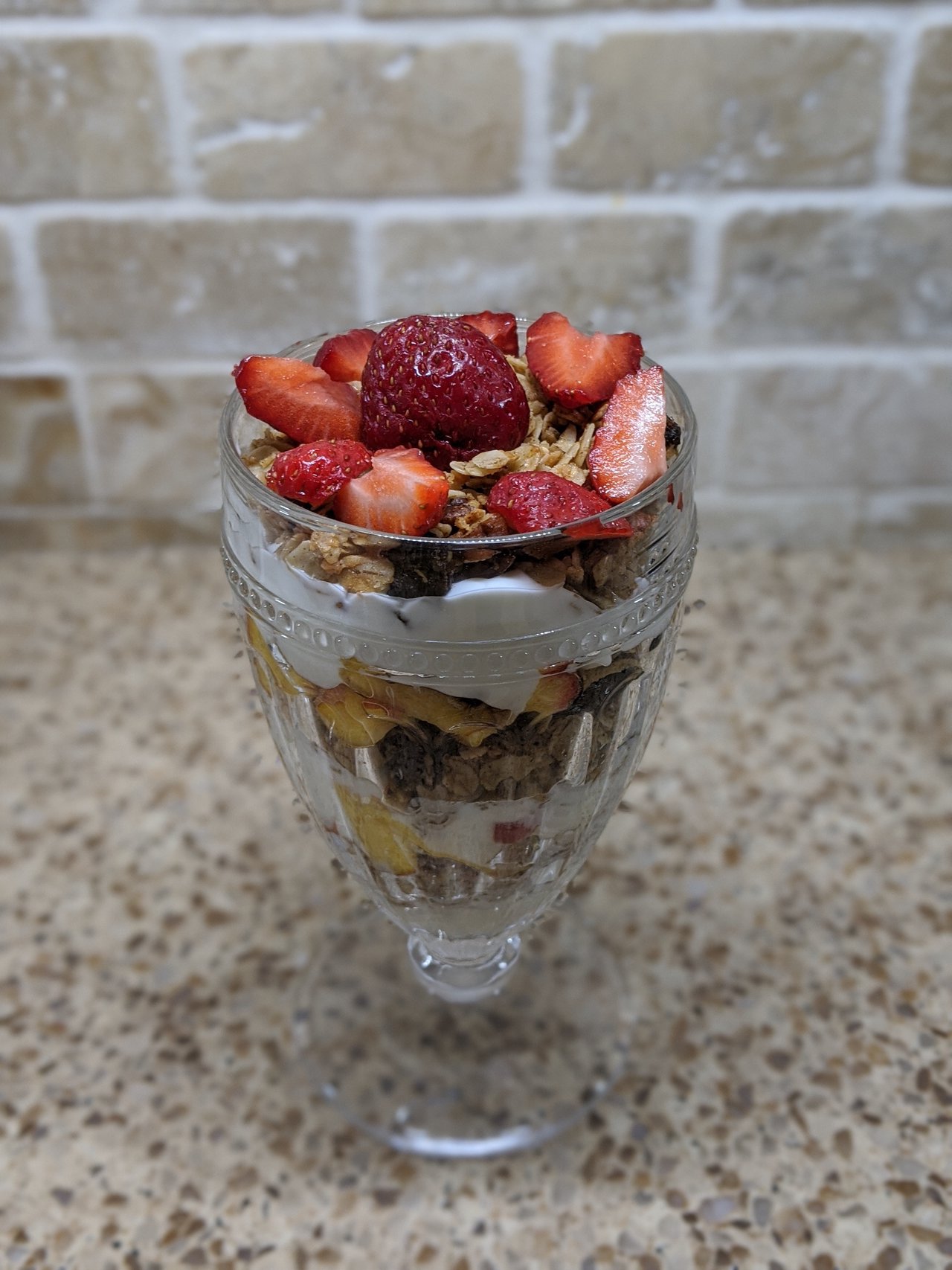 Needed to change up breakfast a little and because we had just stocked up on yogurt I decided to make parfaits. Made granola based with Cookie and Kate’s recipe and it came out great. I added pecans and shredded coconut. It’s so yummy that we probably ate half of it as a snack. Then stacked up the parfait with yogurt, sliced peaches, strawberries, and the granola.