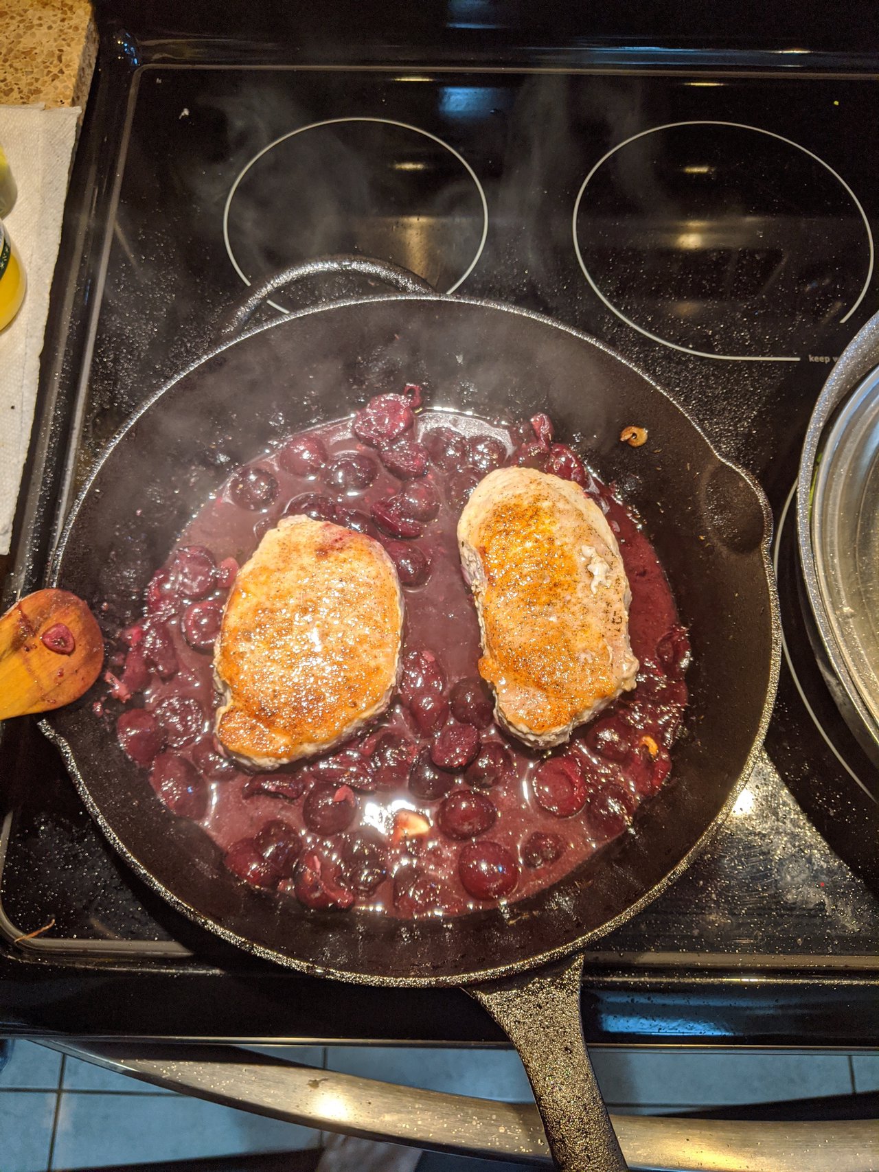 Inspired by New York Time Cooking’s recipe for pork with brandied cherries. It was fantastic, just overcooked the pork a bit.