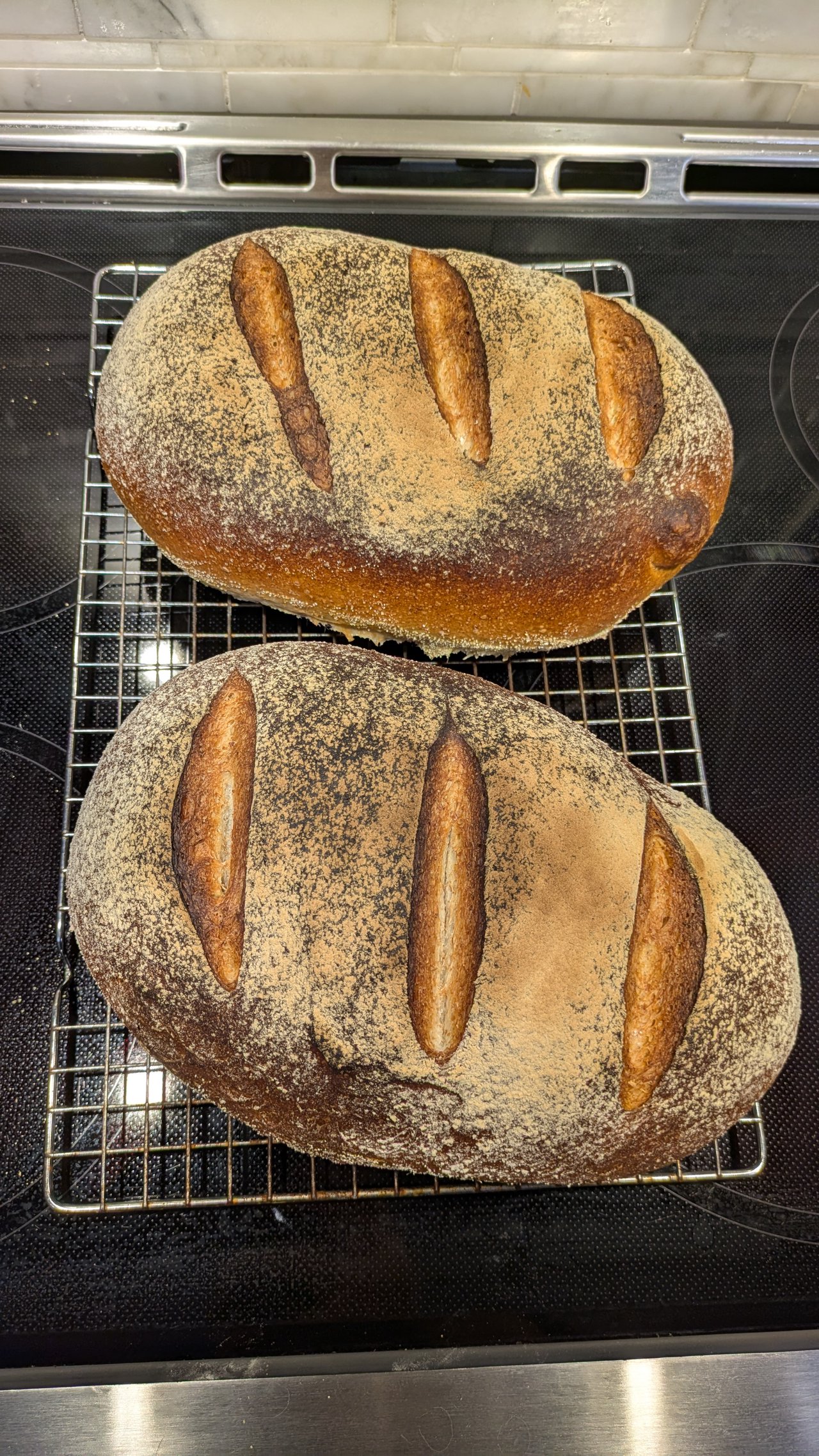 Recently I’ve started making King Arthur Flour’s Easiest Loaf and we’re very much enjoying it. I do roughly half whole wheat flour, half bread flour, and the result is a light, fluffy, bread with a flavorful crust.